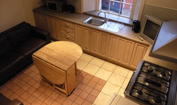 This bright kitchen/living room/dining area is a nice place to relax after a hard day enjoying all Edinburgh has to offer. The tiled floor and neutral walls make this room a comfortable place. The room has 2 leather sofas and a fold away dining table with chairs. Halogen downlighters complete this room.