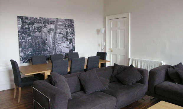 This huge living room is nearly 35m2. It has a 2 piece suite and large stylish dining table. It has two large traditional windows looking out the front of the building.