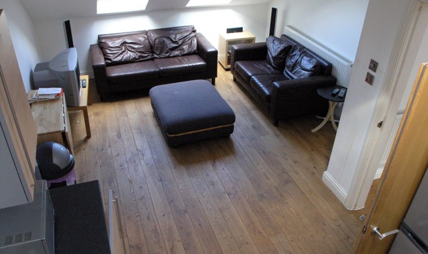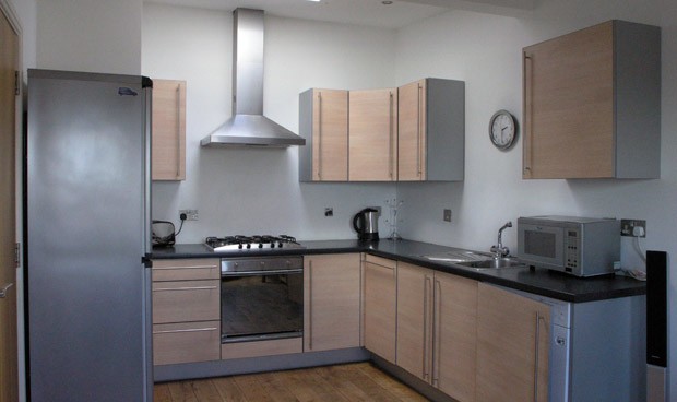 This bright kitchen/living room/dining area is well laid out. The lounge area has two large velux windows which allows light and air to flow in at all times of the day, leather couches and fold away dining table. This beautifully lit space has three lighting circuits all individually dimmable via digital control to match your mood. This room has some of the best views to the castle available, which is lit up at night.
